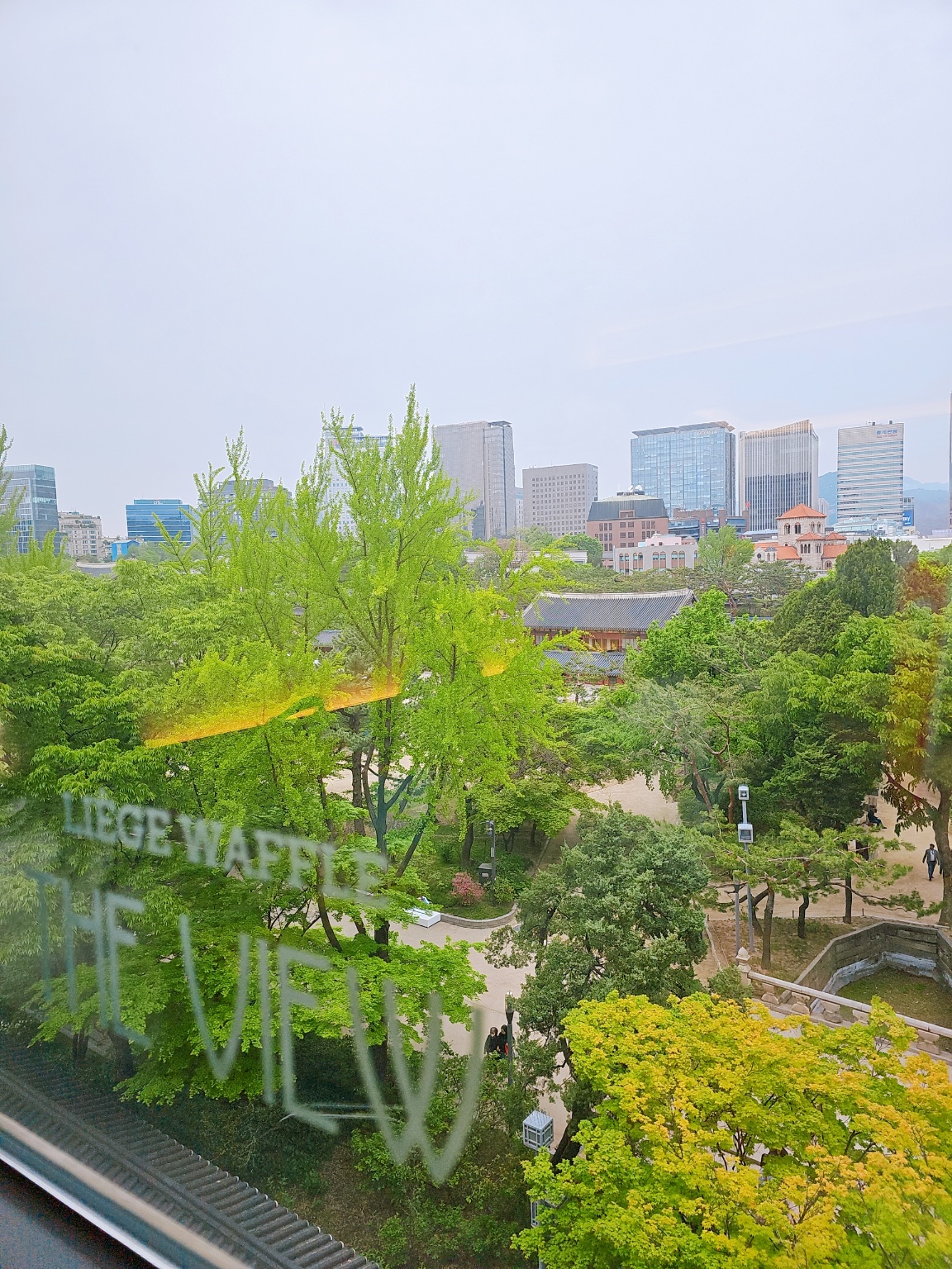 광화문에서 나와 그냥 집 가긴 아쉬운 날, 발길 가는 대로 걷다 보면 도착하게 되는 곳. 덕수궁 돌담길을 따라 걷다가, 고개를 들었을 때 눈에 들어온 ‘리에제와플 더 뷰’라는 간판. 사실 큰 기대 없이 올라갔지만, 엘리베이터 문이 열리는 순간, 감성 끝판왕 공간이 펼쳐졌습니다.이 카페의 핵심은 뭐니 뭐니 해도 창가석 뷰입니다.5층에서 정면으로 내려다보는 덕수궁의 풍경은 정말 영화 세트장 같은 느낌. 특히나 날씨가 흐린 날에도 멋졌으니, 벚꽃 피는 봄날이나 눈 내리는 겨울에는 얼마나 아름다울지 상상만으로도 설렜어요.시청 앞 빌딩들 사이로 고즈넉하게 펼쳐진 궁궐의 풍경.서울 한복판에서 이런 여유를 누릴 수 있다는 게 놀라웠고, 딱 그 순간 하루가 완성된 느낌이었어요.