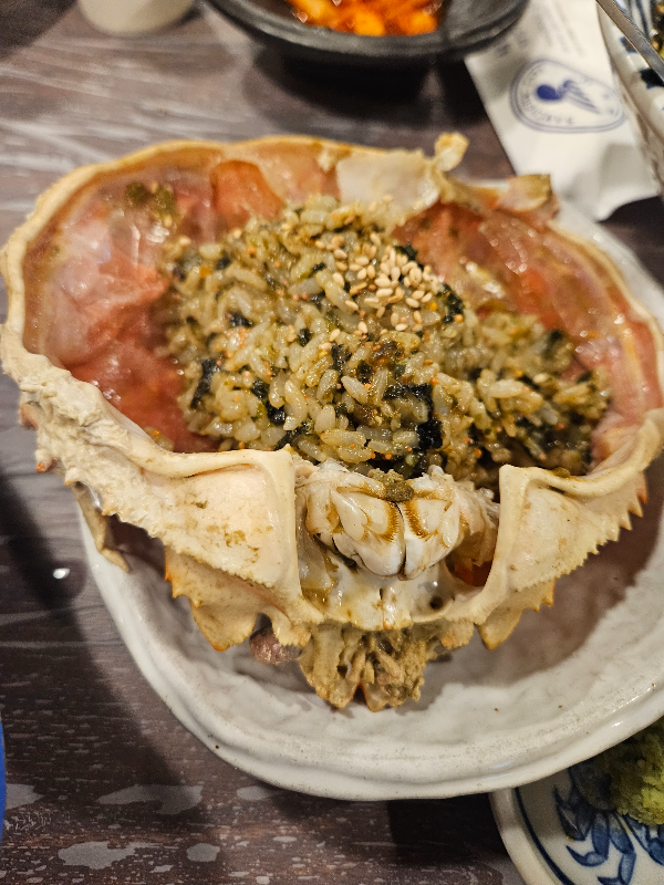 대게 먹고 나면 꼭 먹어야 하는 게딱지 볶음밥! 내장이 가득 들어가서 고소한 맛이 제대로였어요. 역시 대게 코스의 마무리는 볶음밥이죠.이건 세트에 없고 별도 입니다.