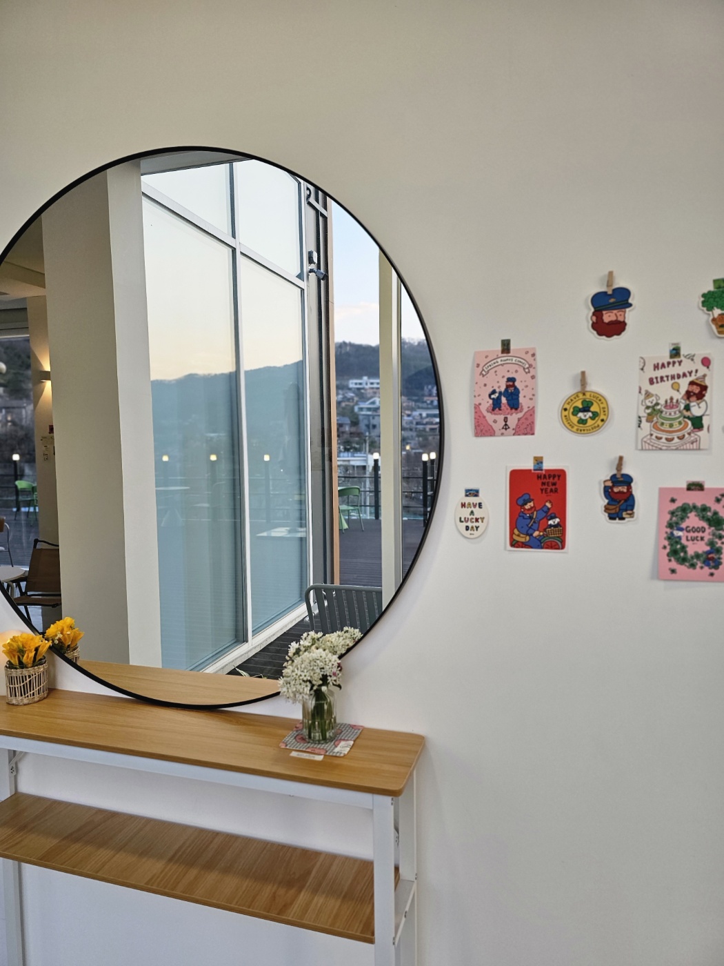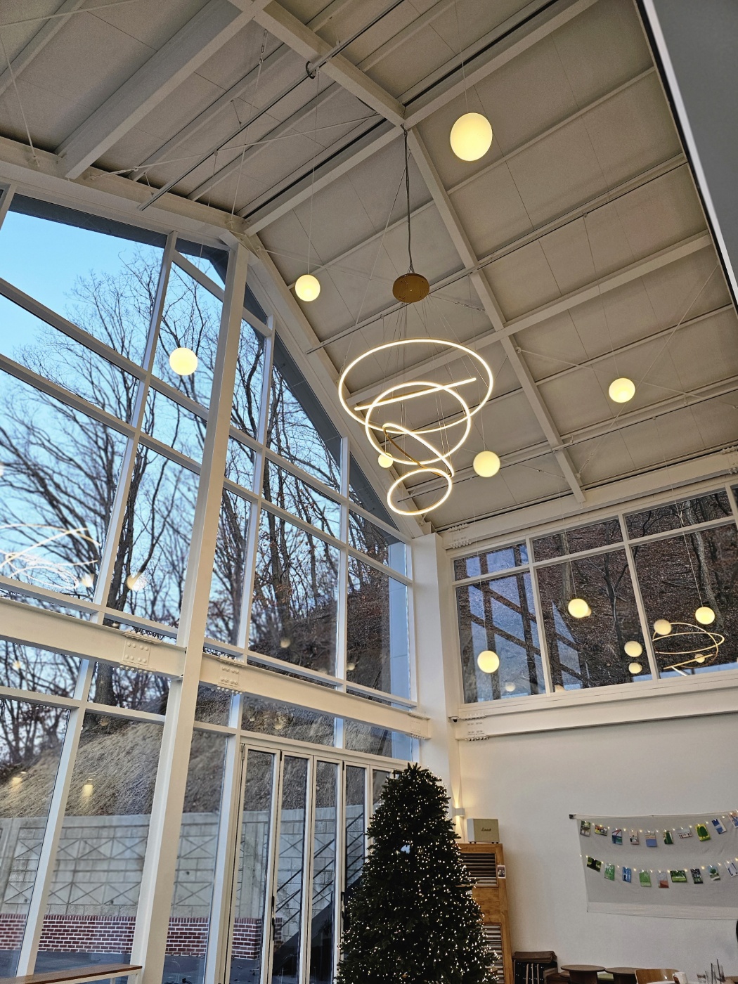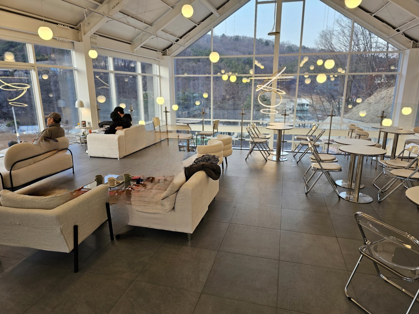 인테리어가 전체적으로 우드톤이라 따뜻한 느낌이었어요. 큰 통창이 있어서 햇빛도 예쁘게 들어오고, 창밖으로 보이는 자연 풍경이 너무 힐링이었어요! 그리고 조명을 예쁘게 해 놓으셔서 뭔가 감성 카페 느낌도 나고, 사진 찍으면 감성샷 제대로 나오겠더라고요.